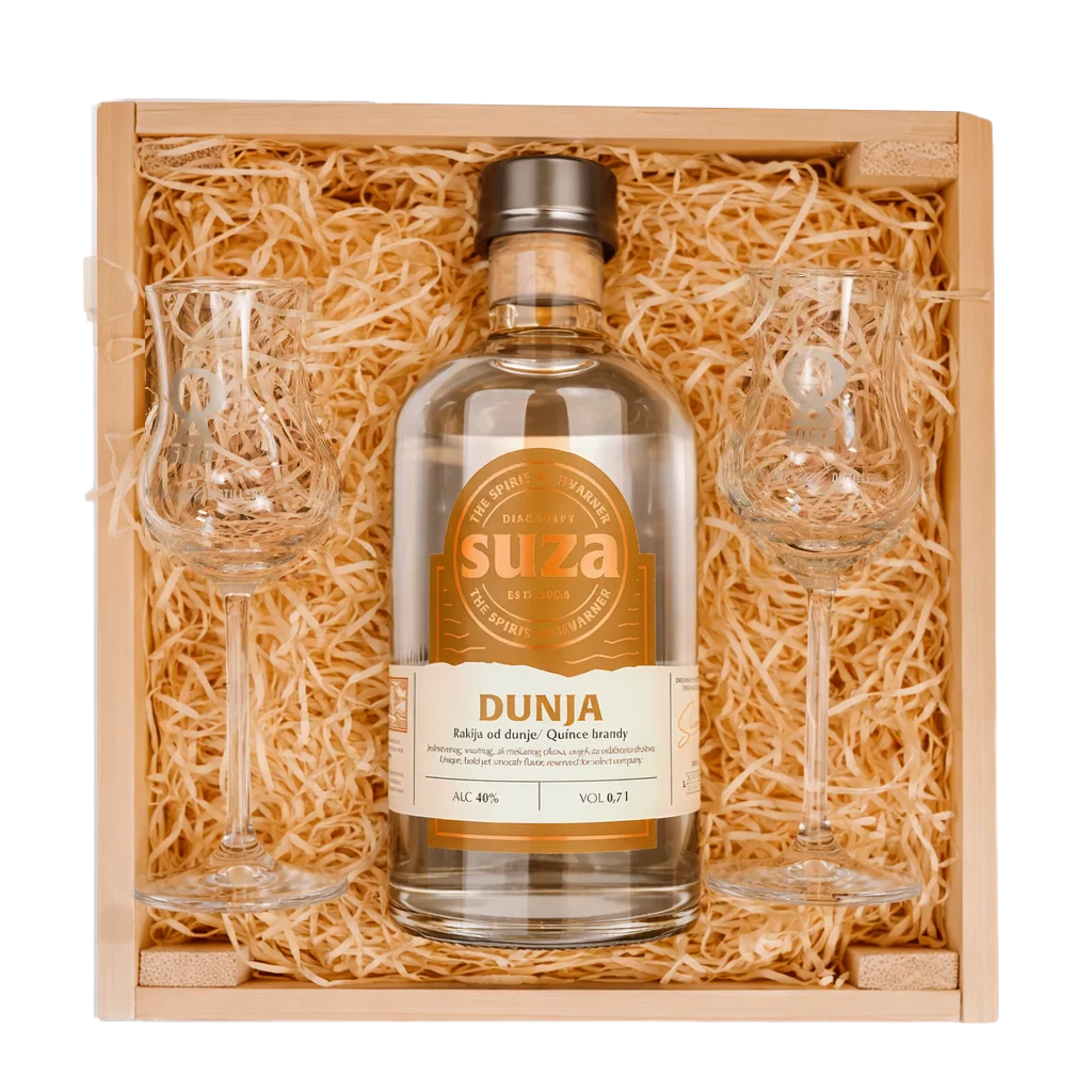 Give an authentic rakija experience with our handcrafted wooden box, which you can personalize by choosing your favorite rakijas – Quince, Apricot, Plum, or Pear. Each rakija is produced from carefully selected fruits, bringing the richness of traditional flavors and aromas. Along with the selected rakijas, the set includes two elegant glasses, perfect for enjoying every sip. This box is the ideal gift for any occasion or a special addition to your home – a combination of elegance, quality, and authentic experience!